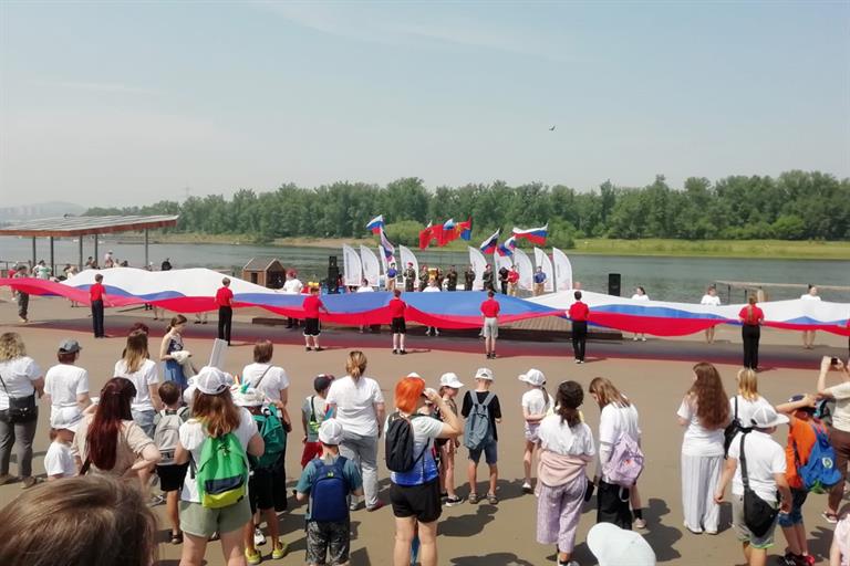 Грандиозное историческое событие завершилось флэшмобом. 23 человека вынесли перед сценой 25-метровый российский флаг под гимн Российской Федерации, ф в это время набережную заполнили школьники и педагоги с текстом гимна на футболках. Все участники и гости события подпевали главной песне страны.