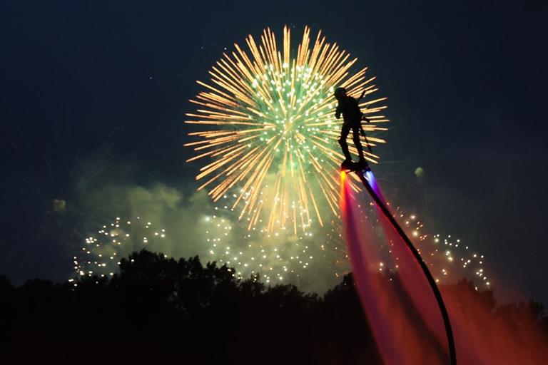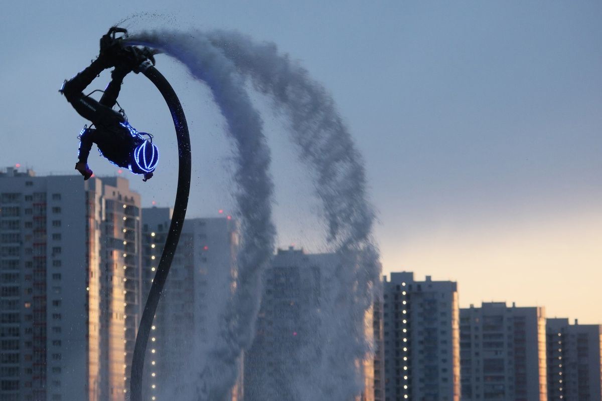 Шоу было разделено на три блока по 15 минут. Каждое сопровождалась бурными овациями горожан. В первом блоке флайбордисты подняли флаг города–именинника. Затем спортсмены в светодиодных гидрокостюмах поднимались в воздух с помощью потоков воды и делали сальто невероятной красоты, паря над гладью Енисея на высоте 18,5 метров. Кульминацией выступления стало пиротехническое шоу, которое сопровождалось фейерверком.