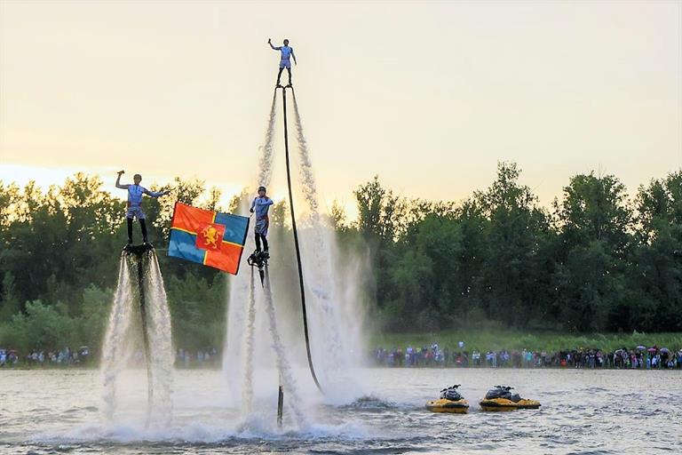 Кульминационным событием праздничной программы стало фееричное водное шоу в исполнении команды «Гидроцирк» на Абаканской протоке Енисея. Посмотреть на захватывающие кульбиты флайбордистов пришли более 15 000 горожан. Они расположились на Ярыгинской набережной, острове Отдыха и Коммунальном мосту за несколько часов до начала мероприятия.