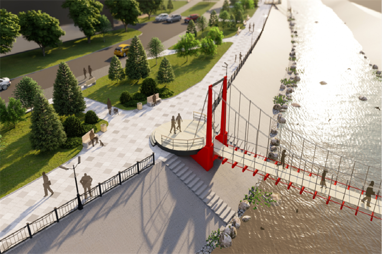​При обсуждении обновления сквера с жителями их главным пожеланием было замкнуть пешеходные пути, соединить дорожки скверов, расположенных на разных берегах реки Кача. Для этого нужно было построить через реку еще один мост.