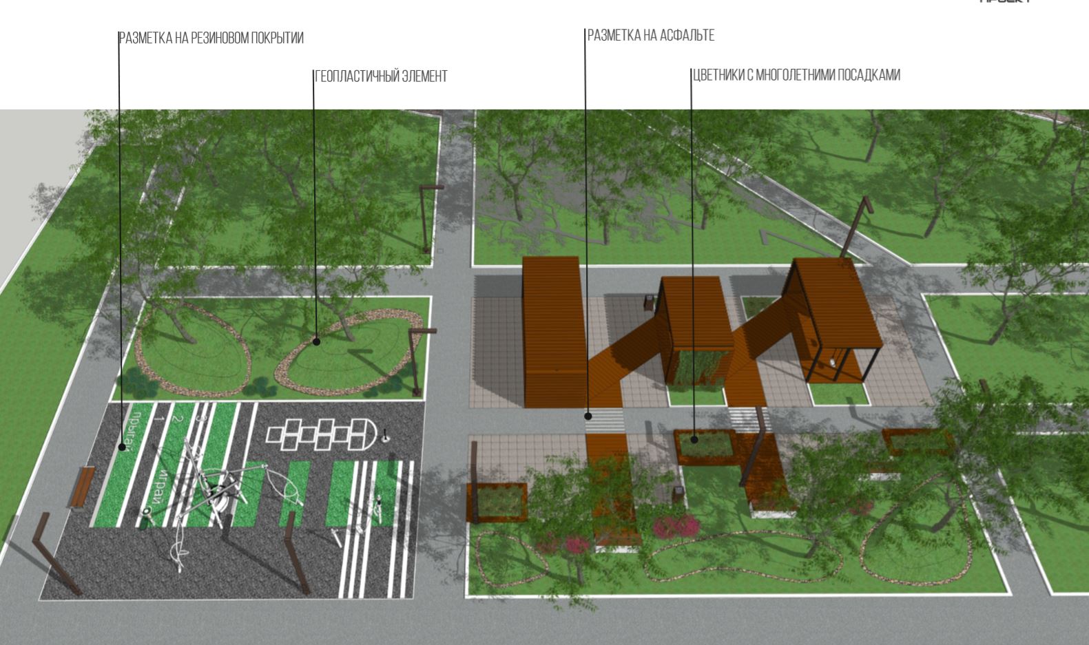 Проектировщики старались продумывать все до мелочей: цветовую гамму основных элементов, сочетание и экологичность используемых материалов, расположение дорожек и МАФов, ландшафтное освещение. Еще одна деталь, характеризующая этот сквер как современное пространство - здесь появятся дог-боксы.