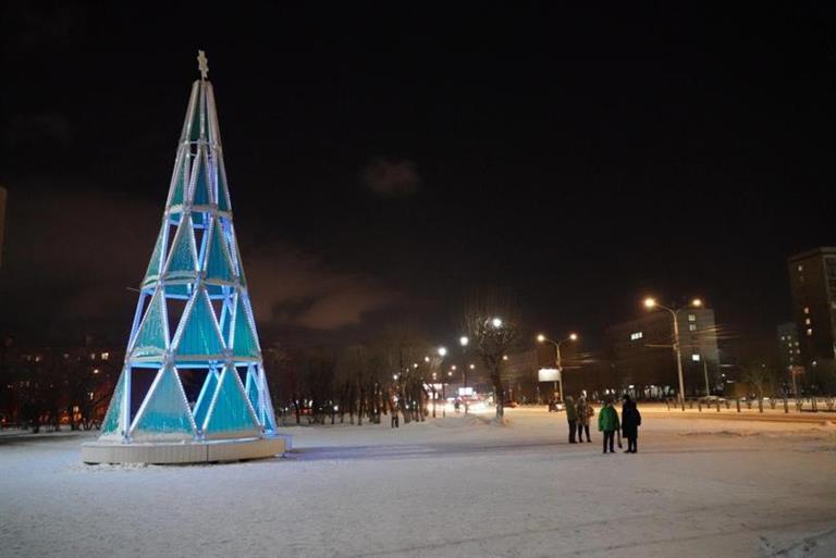 Новогоднюю ёлку высотой 12,5 метров по традиции установили в сквере «Каменный городок» (ул. Щорса, 55).