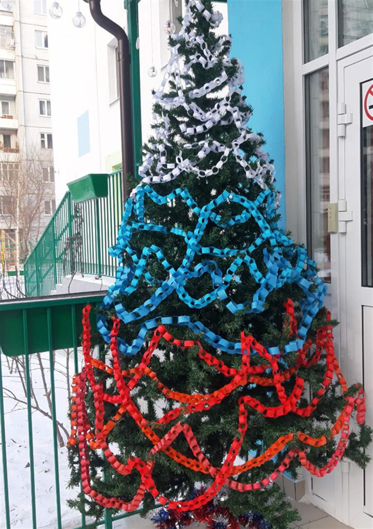 В детском саду №40 входную зону оформили в цвета российского флага. На крыльце поставили ёлку, которую украсили самодельной белой, синей и красной гирляндой. Ёлку, наряженную в цвета триколора, установили и в самом детском саду.
