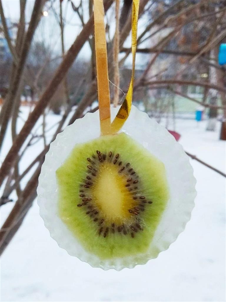 На уличной территории представлены более современные праздничные украшения; на деревьях развесили разноцветные ледяные гирлянды и игрушки. Воспитатели рассказывают, такие игрушки - настоящий тренд этого года, а сделать ледяные фигурки очень просто. В силиконовую формочку нужно добавить пищевой краситель, сухой цветок или дольку фрукта, сделать петельку из ниток, и залив водой, поставить в холод. Уже через несколько часов авторская новогодняя игрушка будет готова.