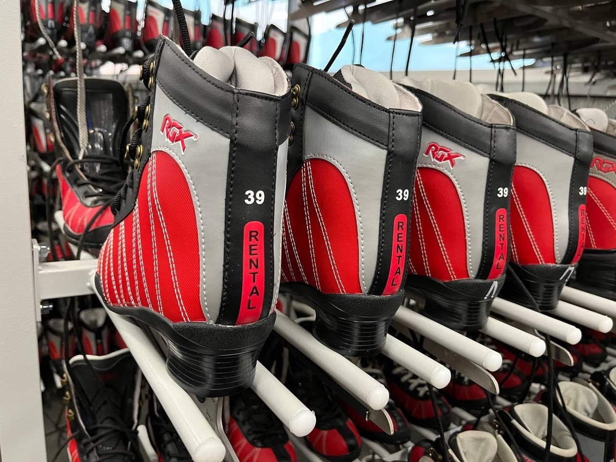 Прокат инвентаря - 150 руб./час, размерный ряд - с 25 по 47. Если у посетителей есть свои коньки, то они могут воспользоваться услугой заточки лезвий.