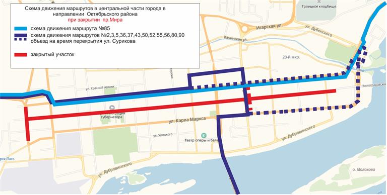 При перекрытии ул. Сурикова в направлении Октябрьского района маршруты, идущие с правого берега (№ 2, 3, 5, 36, 37, 43, 50, 55, 56, 80, 90), будут разворачиваться в районе ТРЦ «Комсомолл» и следовать по ул. Ленина.