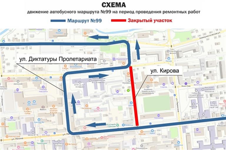 В связи с проведением работ по аварийному ремонту тепловой сети по адресу: ул. Кирова, 40, временно изменится схема движения автобусного маршрута №99. С 07 ноября по 15 декабря 2023 года, автобусы маршрута №99 будут следовать: ул. Ленина – ул. Диктатуры Пролетариата – ул. Ады Лебедевой – ул. Кирова – ул. Республики, далее по установленной схеме.