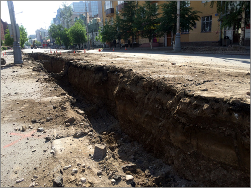 Сейчас на проспекте работает вся необходимая на данном этапе техника. Ремонтные работы, по технологии, начинаются с земляных подготовительных работ, связанных с устройством ливневой канализации. На проспекте уже вырыты траншеи разных размеров – для работы с подземными коммуникациями, сетями и бортовым камнем. Частично демонтированы асфальто-бетонное покрытие и брусчатка. Уже завершилась работа по сверке специальных отметок, по которым затем будет определяться ровность и другие геометрические параметры дорожного полотна. Для того, чтобы качественно провести все земляные работы, а техника могла работать в безопасном режиме, пока на Мира не полностью вскрыт асфальт и тротуарная плитка. Однако и эти виды работ начнут в ближайшее время.