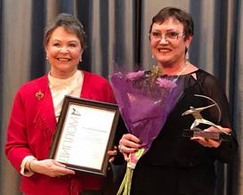 The first director of the Russian Cultural Center in Washington Natalia Batova presents the award to Anna Vernaya