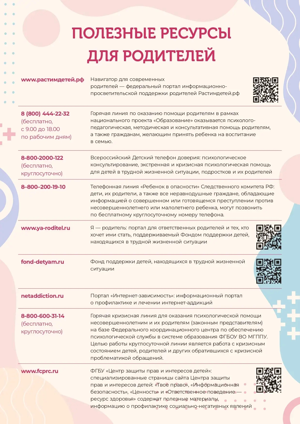 - линия помощи «Дети онлайн» – служба телефонного и онлайн-консультирования оказывает психологическую и информационную помощь детям и подросткам, столкнувшимся с различными проблемами в сети Интернет: http://detionline.com, тел.: 8-800-250-00-15.