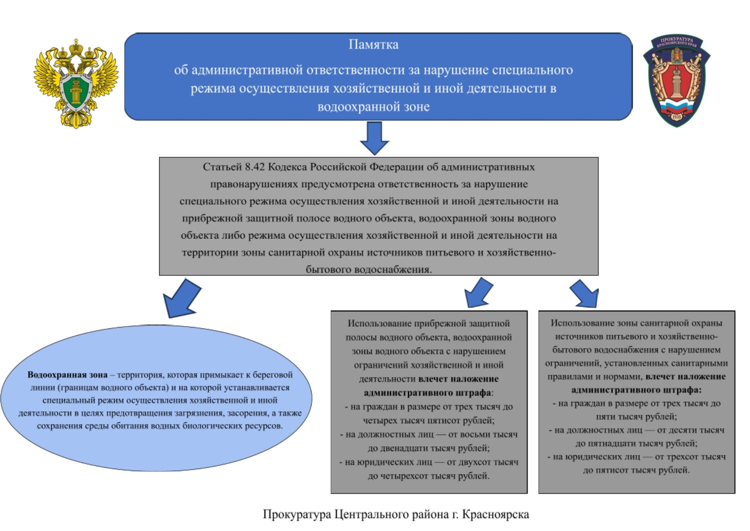 Статьей 8.42 Кодекса Российской Федерации об административных правонарушениях предусмотрена ответственность за нарушение специального режима осуществления хозяйственной и иной деятельности на прибрежной защитной полосе водного объекта, водоохранной зоны водного объекта либо режима осуществления хозяйственной и иной деятельности на территории зоны санитарной охраны источников питьевого и хозяйственно-бытового водоснабжения.