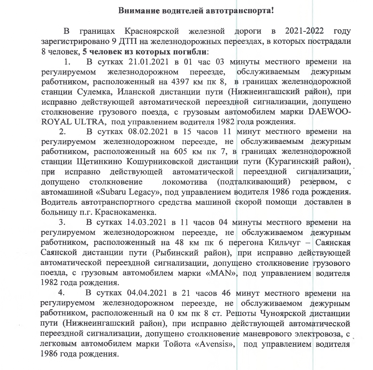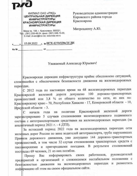 С 2012 года по настоящее время на 77 железнодорожных переездах Красноярской железной дороги допущено - 114 дорожно-транспортных происшествий, из них по: Красноярскому краю - 79, Республики Хакасии - 21, Кемеровской области - 10, Иркутской области - 4.