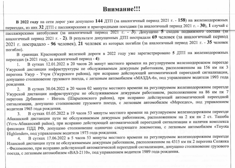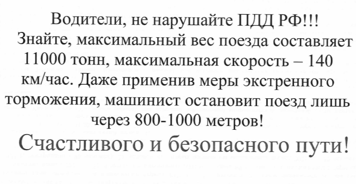 Уважаемые жители просим вас отнестись со всей серьезностью к соблюдению правил дорожного движения при пересечении железнодорожных линий в границах переездов. Помните, нарушая, вы подвергаете себя и людей, находящихся в поезде/салоне автомобиля смертельной опасности!