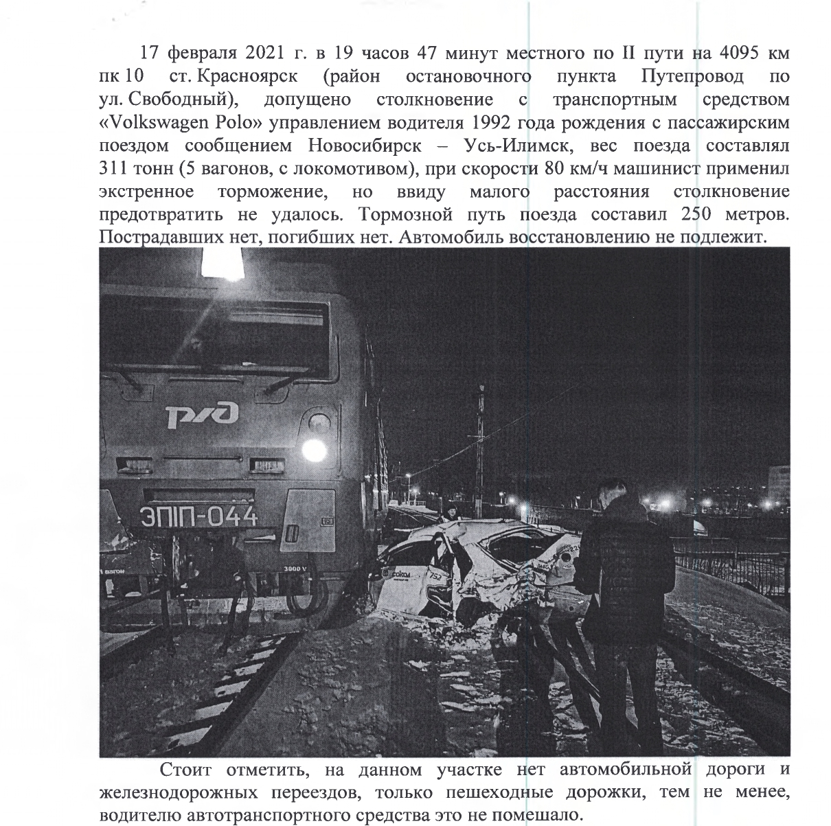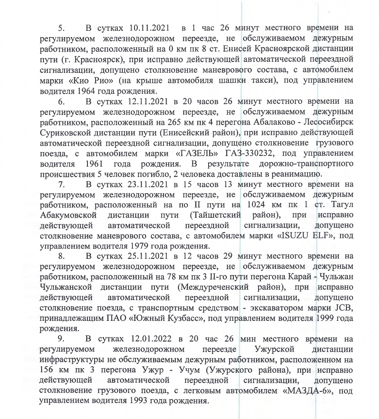 В границах Красноярской железной дороги за 2024 год зарегистрировано 3 ДТП на железнодорожных переездах, 3 ДТП вне железнодорожных переездов, 6 ДТП на переездах и железнодорожных путях, без столкновения с подвижным составом.