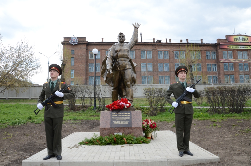 Памятник солдата был установлен в 1950 годы на территории Химкомбината «Енисей». Проведя ремонтно-восстановительные работы, скульптура заняла достойное место в композиции, посвященной всем пропавшим без вести. В постаменте скульптуры установлена капсула с землей, которую привезли из Новгородской области участники поисковой группы «Енисейские патриоты» 148 школы. Именно в Старорусском районе Новгородской области вела бои 44-я отдельная стрелковая бригада. Формирование бригады, подготовка и боевое слаживание частей и подразделений 44-ой бригады проходили в Красноярске с 19 октября по 16 ноября 1941 года.