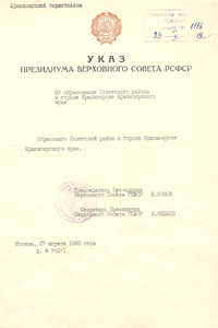 Официально район был образован 27 апреля 1969 года Указом Президиума Верховного Совета РСФСР "Об образовании Советского района в городе Красноярске Красноярского края". Он был выделен из границ Центрального района и разместился в северо-западной части города на площади 115 квадратных километров. Здесь проживало 67 тысяч человек, работало 15 крупных промышленных предприятий, 11 строительных организаций, крупные транспортные предприятия: авиапредприятие, автобусное депо, пассажирское и грузовые автопредприятия.