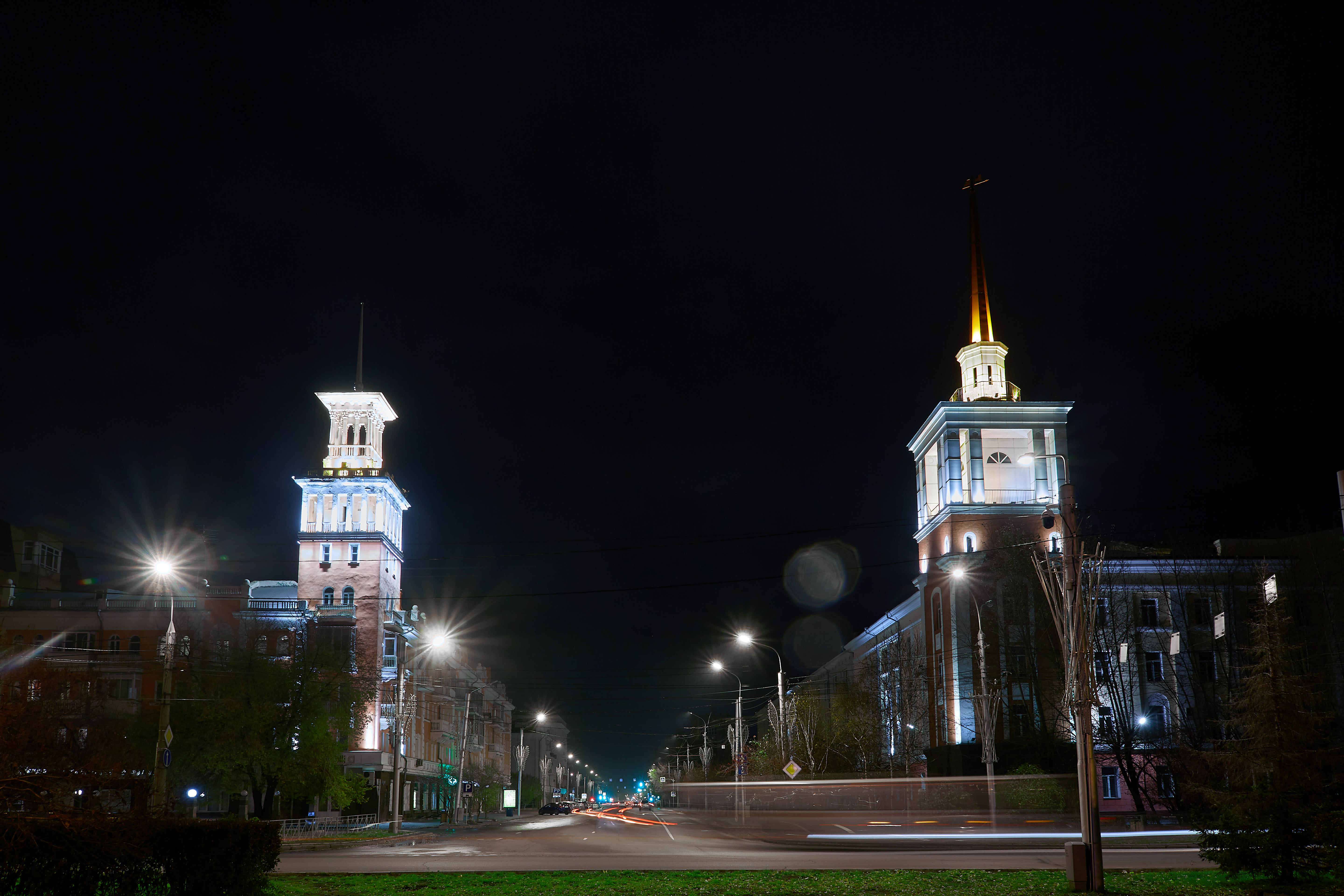Здание слева - обычный жилой дом по ул. Карла Маркса, 132, построенный в 1953 году для работников Красноярского электровагоноремонтного завода. Является объектом культурного наследия регионального значения "Дом жилой, 1950-е г.г." Здание справа входит в комплекс радиозавода, который занимает целый квартал и находится в границах улиц Бограда, Робеспьера, Карла Маркса, Декабристов. Изначально архитекторами был задуман въезд на ул. Карла Маркса от Красной площади с башнями со шпилями на обоих зданиях. Возведение сооружений с различными украшениями во времена Хрущёва признавалось спорным и несоответствующим современной архитектуре. На жилом доме башню успели сделать, а производственное - так и осталось с каким-то нелепым завершением и деревянным шестом на крыше. Яркий образ, завершающий оформление Красной площади, был воплощён в жизнь в 2005 году. Башня радиозавода была возведена по первоначальному проекту, к нему добавили только чуть современности: флюгер - герб Красноярска. Высота башни со шпилем - 49 метров, что вполне соответствует габаритам сооружения. Конечно, шпиль немного выше украшающего жилой дом, но ночная подсветка максимально сглаживает отличие. Кстати, подсветка на обеих башнях со шпилями появилась тоже в 2005 году.