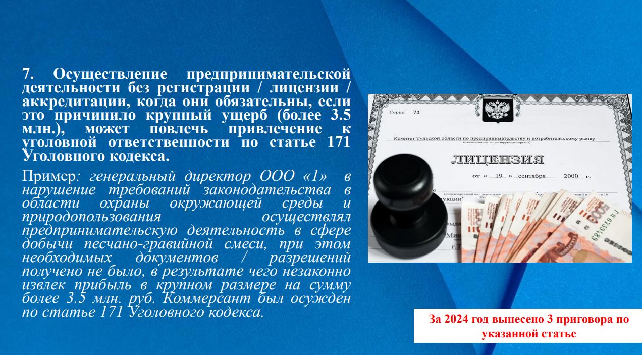 Предлагаем ознакомиться с методическими рекомендациями для предпринимателей. Из них вы узнаете, какие нарушения в сфере бизнеса могут повлечь за собой судебные тяжбы и уголовное преследование. Мы оформили их в виде 16-ти фотокарточек, которые вы можете посмотреть и легко скачать для себя, чтобы они всегда были под рукой.