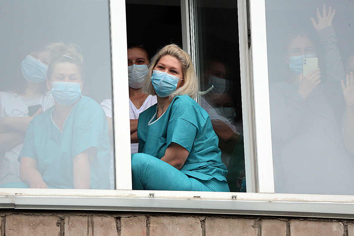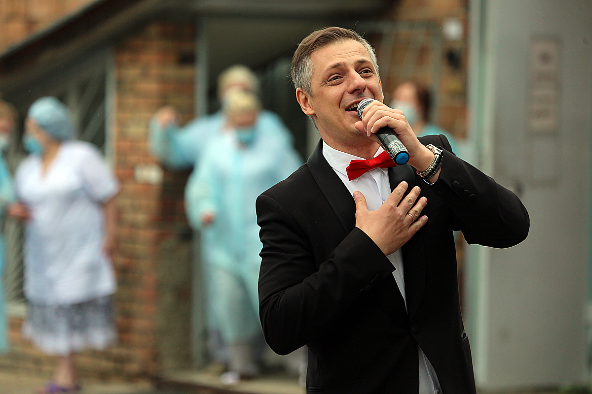 Красноярский хоровой ансамбль солистов «Тебе поемъ» выступил с концертом для врачей, медицинского персонала и пациентов Краевой клинической больницы. Уличной сценой для артистов стала территория между главным и легочно-аллергологическими корпусами. Сейчас здесь работают 512 врачей, 148 из которых находятся на карантине. Пациентов же в инфекционных блоках более 300 человек.