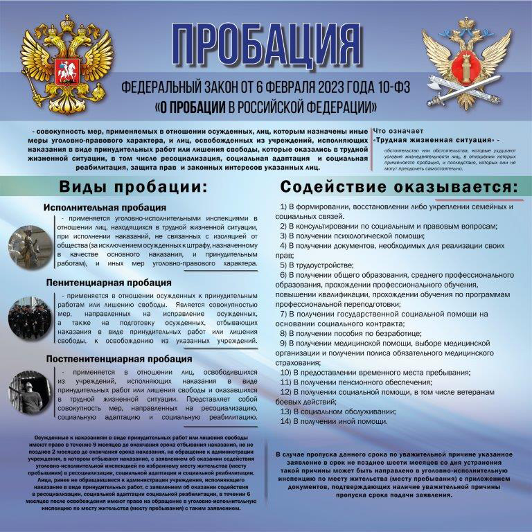 С 1 января 2024 года в нашей стране начал действовать Федеральный закон от 06.02.2023 № 10-ФЗ «О пробации в Российской Федерации», который помимо учреждений уголовно-исполнительной системы чётко определил другие субъекты пробации – федеральные органы исполнительной власти, органы государственной власти субъектов Российской Федерации, государственные учреждения службы занятости населения, организации социального обслуживания.