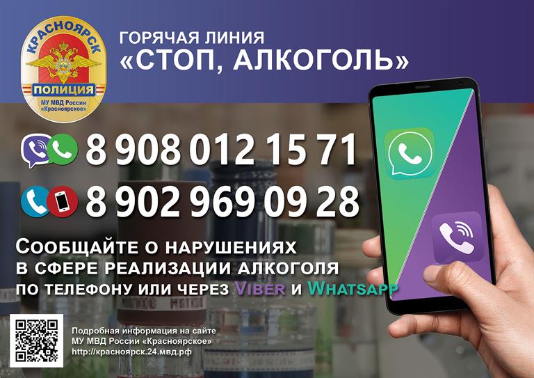 В МУ МВД России «Красноярское» работает горячая линия «Стоп, алкоголь» по пресечению нарушений законодательства в сфере оборота алкогольной продукции.