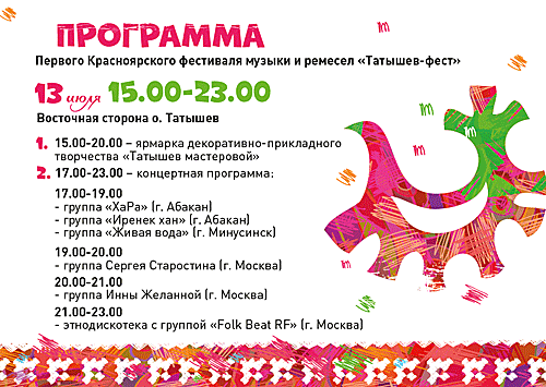13 июля с 15.00 до 23.00 в восточной зоне Татышев-парка красноярцы и гости города смогут окунуться в этническое пространство в рамках Первого Красноярского Фестиваля музыки и ремесел «Татышев-фест».