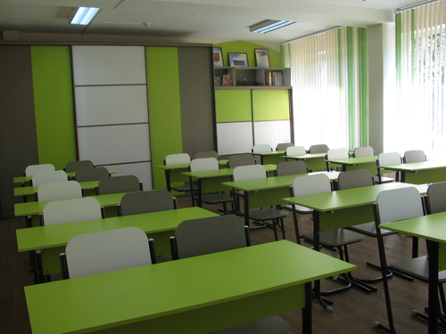 Номера кабинетов гимназии больше не нужны, классы вполне можно опознавать по цветам – бирюзовый, розовый, салатовый. Столы, стулья, шкафы - даже мотивирующие надписи на стенах выполнены в единой гамме.