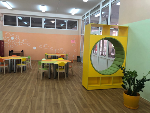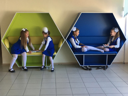 Для учеников начальных классов оборудовали этаж словесности. В холлах развешаны книжные полки необычной формы, стены «исписаны» стихами и цитатами, а дети смогут читать книги, лёжа в шестигранных креслах.