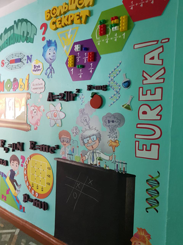Учить детей будут не только педагоги, но и стены. Школьные холлы теперь исписаны математическими формулами, историческими фактами и вопросами на эрудицию. На грифельном покрытии теперь можно порисовать мелками, а для малышей оборудовали детскую - уголок с ковром, креслами-мешками и игрушками.