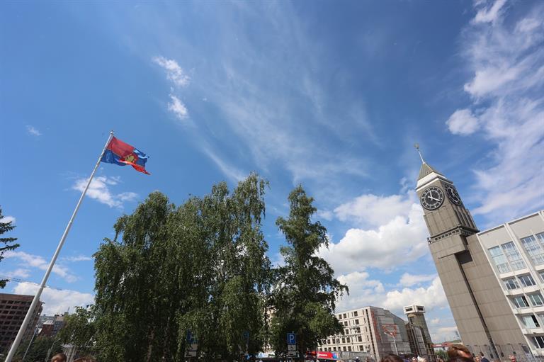 В честь Дня города над площадью у городских часов поднят флаг Красноярска