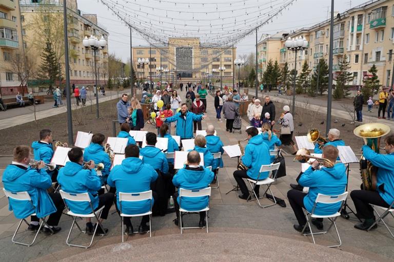 После торжественного митинга на площади у мемориала «Красноярск – город трудовой доблести» состоялось выступление городского духового оркестра.