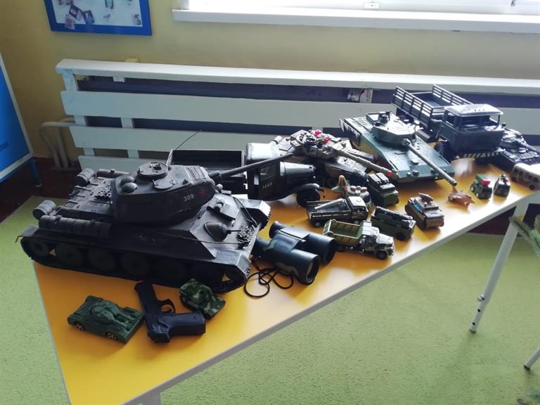 Родители воспитанницы старшей группы «Капелька» Кристины Голубевой принесли два уникальных экспоната: автомобиль полуторку и танк Т-34. Обе модели сделаны вручную.