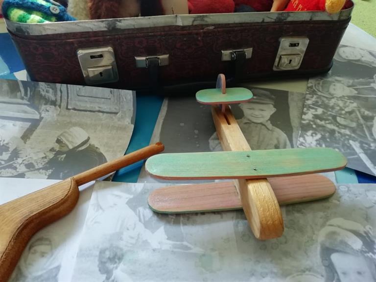 Воспитатели кинули клич среди родителей, предложив таким образом рассказать о 78-й годовщине Победы малышам. Отозвались больше 15 семей. Одни нашли любопытные фото военных лет в сети, другие распечатали портреты своих родственников с игрушками времён Великой Отечественной, а третьи смастерили из дерева самолёты и пистолеты, как это делали родители для своих детей во время войны и еще долгое время после.