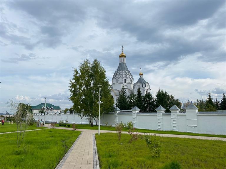 Ранее на участке располагались овощехранилища и заросли травы. Сейчас в обновлённом пространстве появились пешеходные тропинки общей площадью 793 кв. м из брусчатки, резинового покрытия, покрытия из песка и мульчи. Все красноярцы, в том числе мамы с колясками, пожилые люди, люди с ограниченными возможностями здоровья могут комфортно провести время, прогуливаясь и любуясь храмом. Через весь сквер предусмотрели транзитное движение, обустроили детские площадки и зоны событийности. Также здесь разместили арочные навесы, малые архитектурные формы для детей разного возраста, скамейки, дог-боксы для прогулок с домашними животными. Дополнительно территорию озеленили крупномерными деревьями, кустарниками и газоном.