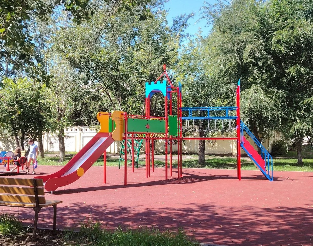 Во дворе дома по проспекту имени газеты «Красноярский рабочий», 40 уложили травмобезопасное покрытие. На нём разместили карусель и детский игровой комплекс с горкой.