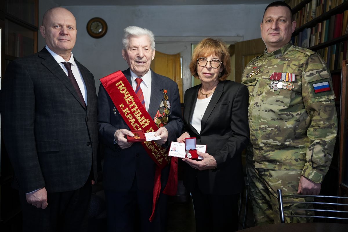 На днях мэр Красноярска Владислав Логинов, председатель Красноярского городского Совета депутатов Наталия Фирюлина, заместитель председателя «Союза ветеранов специальной военной операции» Алексей Гладышев вручили Петру Романовичу Иртюге знаки отличия звания «Почётный гражданин города Красноярска» и памятную медаль 80-летия Победы.