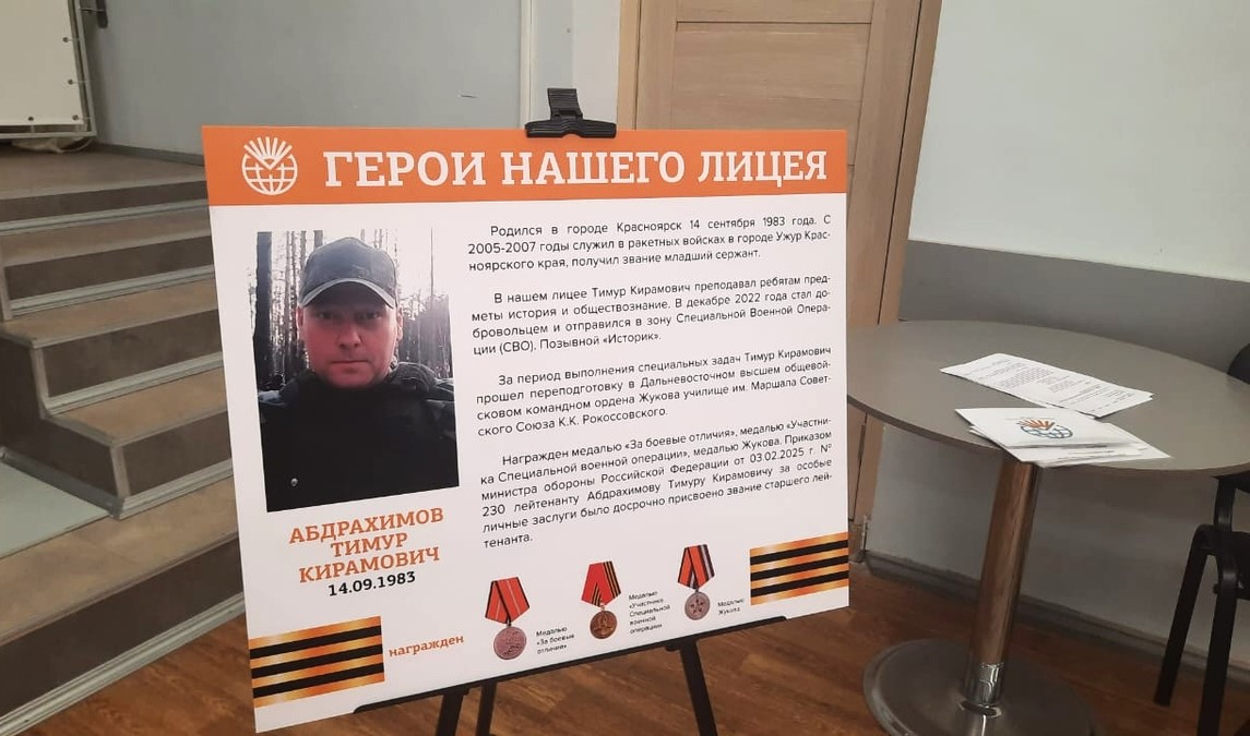 Третью доску героя посвятили учителю истории Тимуру Абдрахимову с позывным «Историк». В декабре 2022 года он отправился добровольцем в зону специальной военной операции. Боец награждён медалью Жукова и «За боевые отличия». Совсем недавно через благотворительный фонд «ИZ Сибири – сынам России» школьники передали ему беспилотный летательный аппарат "Пиранья-10" и посылку с медикаментами.