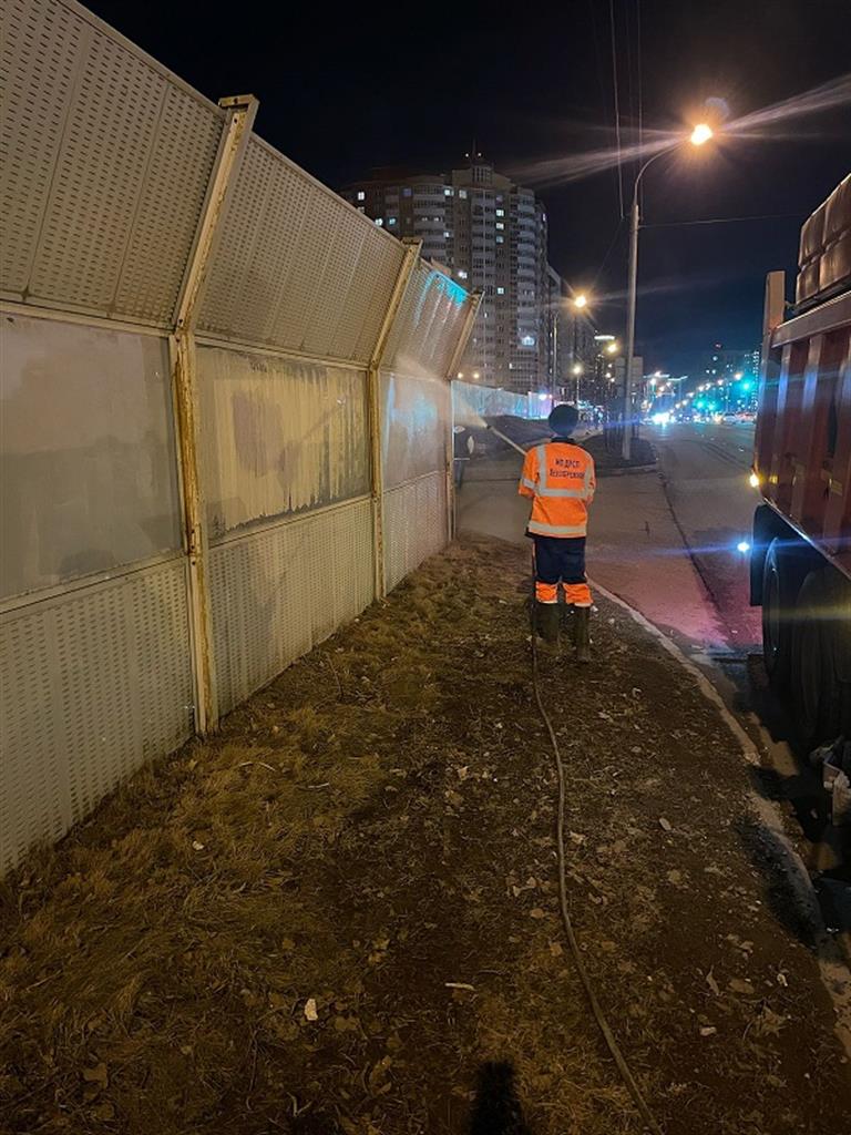 Влажную уборку в городе проводят даже во время осадков. В дождь грязь, присохшая к ограждениям, смывается быстрее.