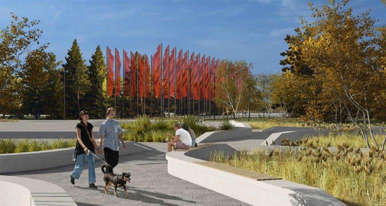 В концепции предложено максимально сохранить существующие деревья, а также выполнить дополнительное озеленение, используя тематику Родины – предусмотреть полевые культуры, берёзы, кустарники с красными ветвями.