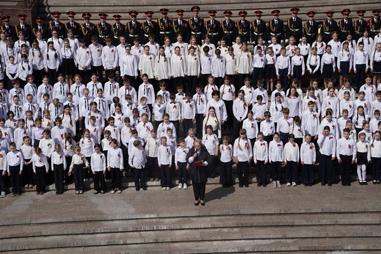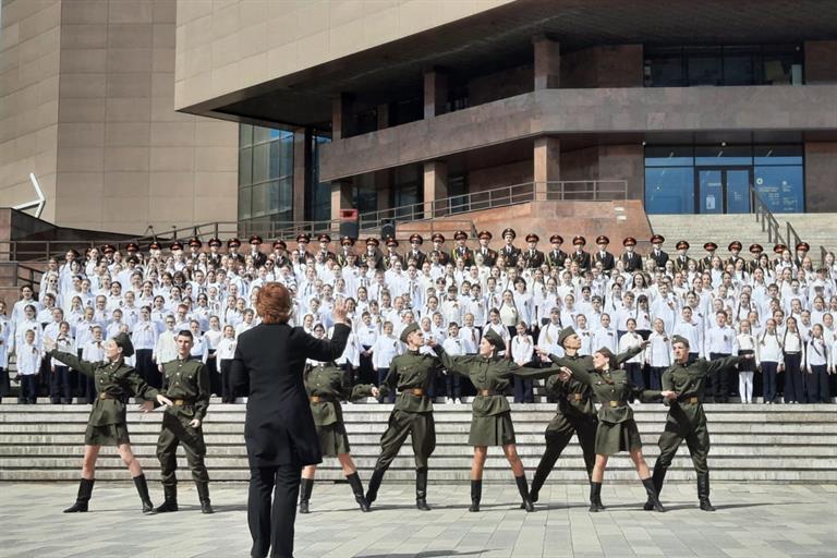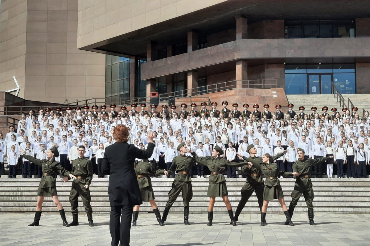 Красноярский школьный сводный хор из 300 детей исполнил для жителей и гостей города песни военных лет в честь предстоящего Дня Победы.