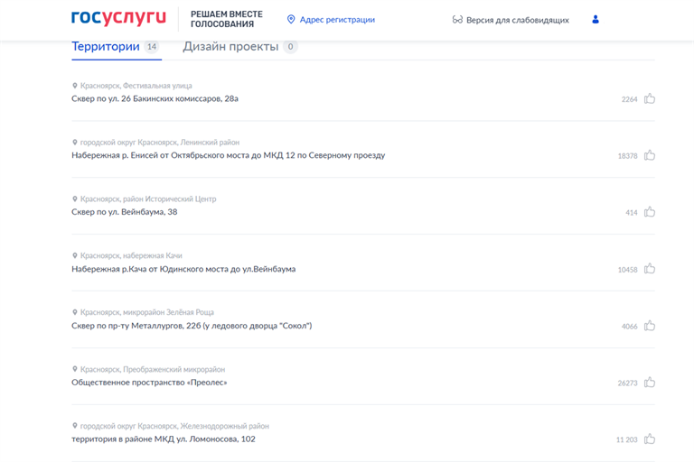 В голосовании определились лидеры. Уже четвёртую неделю на первом месте держится общественное пространство «Преолес» в микрорайоне Преображенский. Свои голоса за его благоустройство отдали почти 26 тысяч человек. На втором месте – набережная Енисея в Ленинском районе (от Октябрьского моста до Северного проезда, 12). За неё проголосовало больше 18 тысяч человек. Третье место у площади перед Дворцом культуры на ул. Высотной – за модернизацию этого объекта высказались более 17,7 тысяч человек.