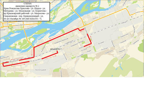 Маршрут №2: Храм Рождества Христова – ул. Щорса – ул. Мичурина – ул. Московская – пр. им. газ. Красноярский рабочий – ул. Матросова – ул. Свердловская – пер. Кривоколенный – ул. 60 лет Октября, д.169а (МП «КПАТП №7»).