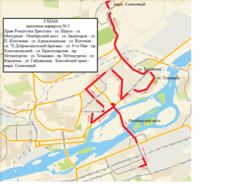 Маршрут №3: Храм Рождества Христова – ул. Щорса – ул. Мичурина – Октябрьский мост – ул. Авиаторов – ул. Партизана Железняка – ул. Аэровокзальная – ул. Взлетная – ул. 78 Добровольческой бригады – ул. 9 мая – пр. Комсомольский – ул. Краснодарская – пр. Металлургов – ул. Тельмана – ул. Воронова – ул. Гайдашовка – Енисейский тракт – мкрн. Солнечный.