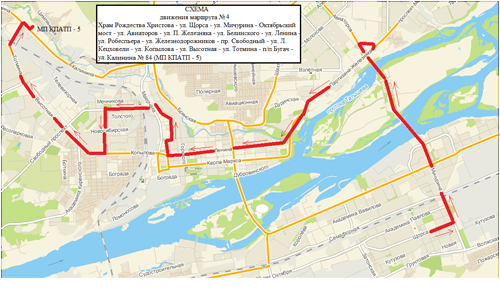 Маршрут №4: Храм Рождества Христова – ул. Щорса – ул. Мичурина – Октябрьский мост – ул. Партизана Железняка – ул. Белинского – ул. Ленина – ул. Железнодорожников – пр. Свободный – ул. Ладо Кецховели –