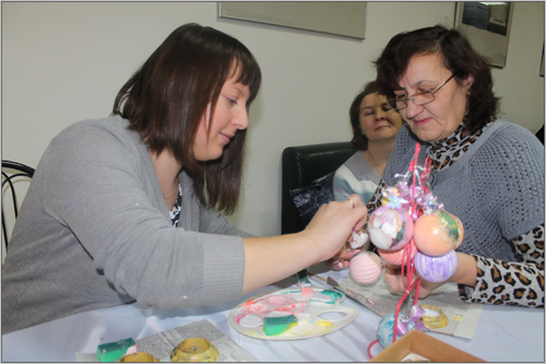 Перед началом концерта, в холле работали мастер-классы по изготовлению новогодних подарков – символ года в стиле «скрап-букинг» и изготовление ёлочных украшений в технике «декупаж». Приглашённые приняли живое участие, и оставили себе памятные сувениры, сделанные своими руками.